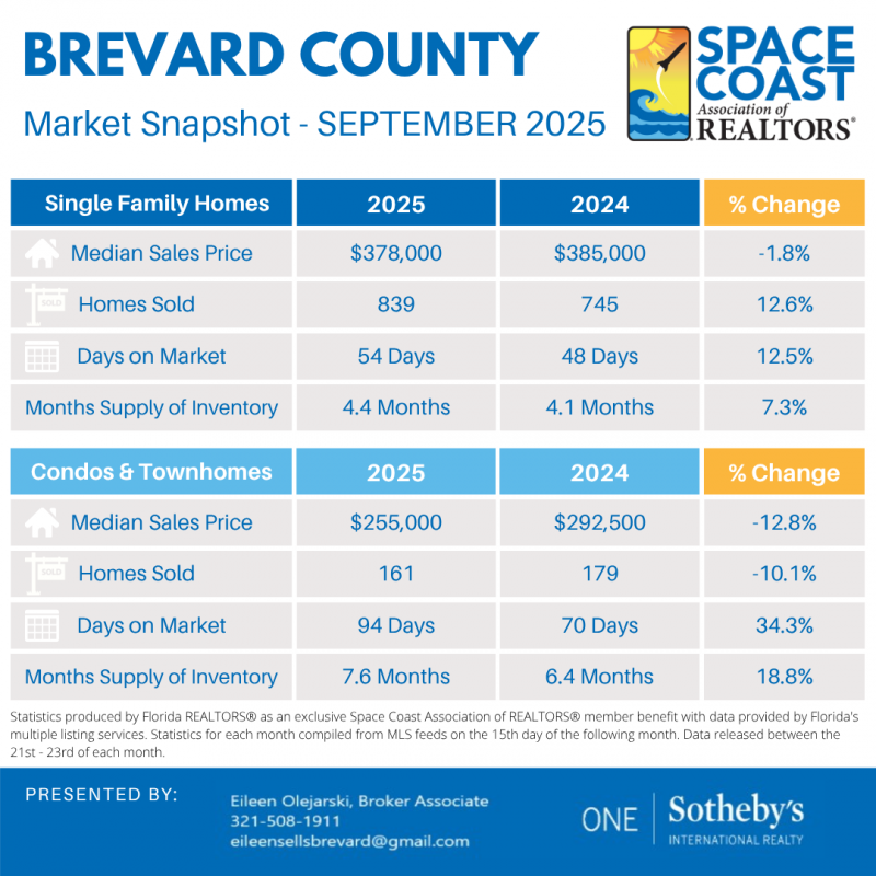 The Brevard County townhouse and condo market showed a slowdown in September 2025, with fewer closed sales compared to last year despite a slight increase in cash transactions. New pending sales saw a small rise, while new listings decreased slightly, indicating less inventory coming to market. Median sales prices dropped noticeably, suggesting that properties are selling for less than a year ago. Inventory levels have increased, giving buyers more options and indicating that homes are staying on the market longer. Traditional sales declined, and foreclosure and short sale activity remained minimal. Overall, the market reflects reduced sales activity, softer prices, and a higher supply, giving buyers more negotiating power.